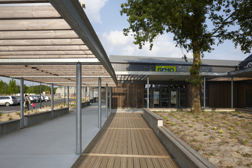Un soin particulier a été apporté à la composition du plan-masse et notamment du traitement des stationnements : il n’y a pas un seul grand parking, mais plusieurs, de tailles plus modérées, hiérarchisant différents niveaux de proximité et de qualité. Les bâtiments, avec leur toiture à double pente et leur bardage bois font référence à un univers domestique, plus sympathique, avec l’ambition de créer des espaces commerciaux à échelle plus humaine.